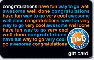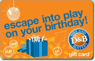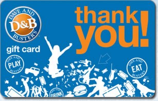 Use of this gift card (“Card”) constitutes acceptance of the following terms and conditions: This Card may only be redeemed for the purchase of food, beverages, game play, merchandise, taxes and gratuities, but not special events or private parties at any Dave & Buster’s in the United States. This Card will not be redeemed for cash except as may be required by law. This is not a credit/debit Card and has no implied warranties. If the Card is lost, stolen or damaged, it will not be honored or replaced except as may be required by law. House policies vary by location – please check www.daveandbusters.com/locations for details. This Card is issued by D&B Marketing Company, LLC a Virginia limited liability company. © 2024 All rights reserved. For Card balance information, call 1-888-386-5230 or visit daveandbusters.com/gift-cards.